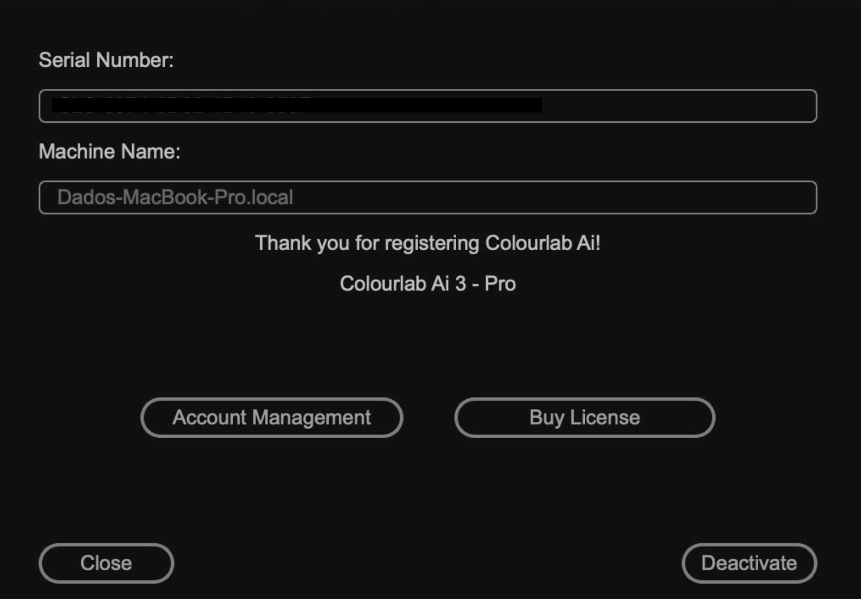 Once activated, a confirmation window should appear. Make sure it includes the text: “Thank you for registering ColourLab AI, ColourLab AI 3 Pro” Important: Ensure that it specifies Pro version to confirm full access to all professional features.